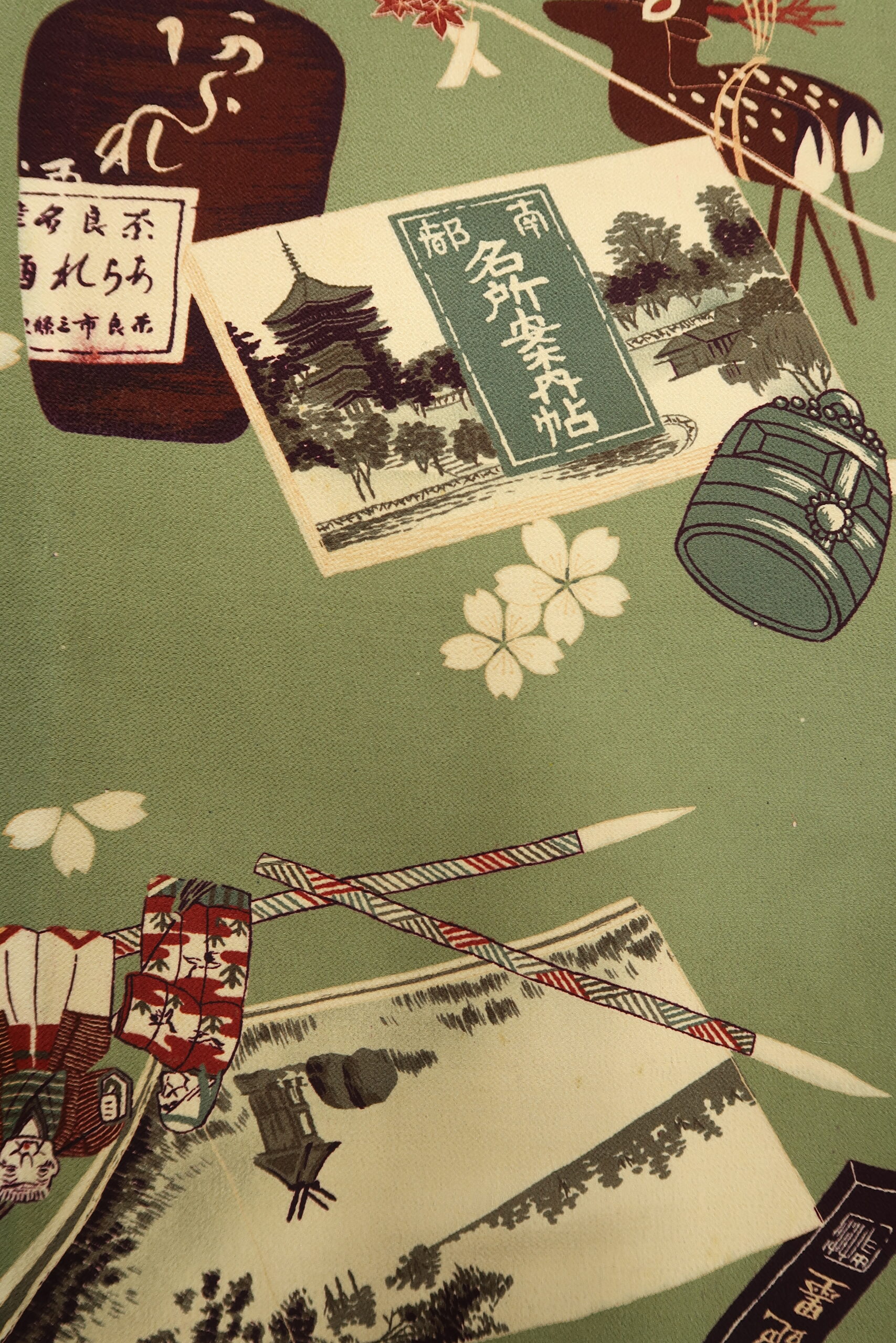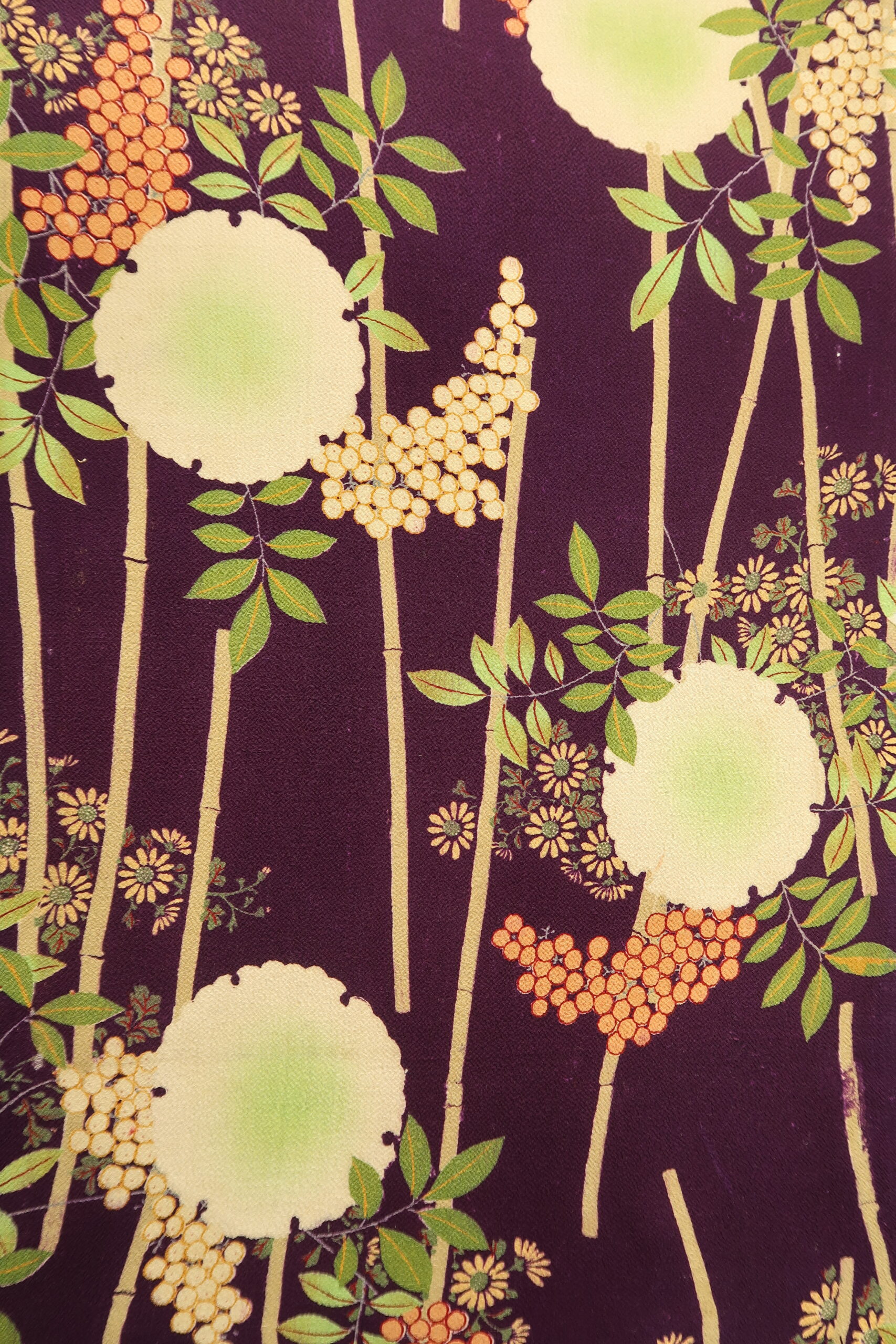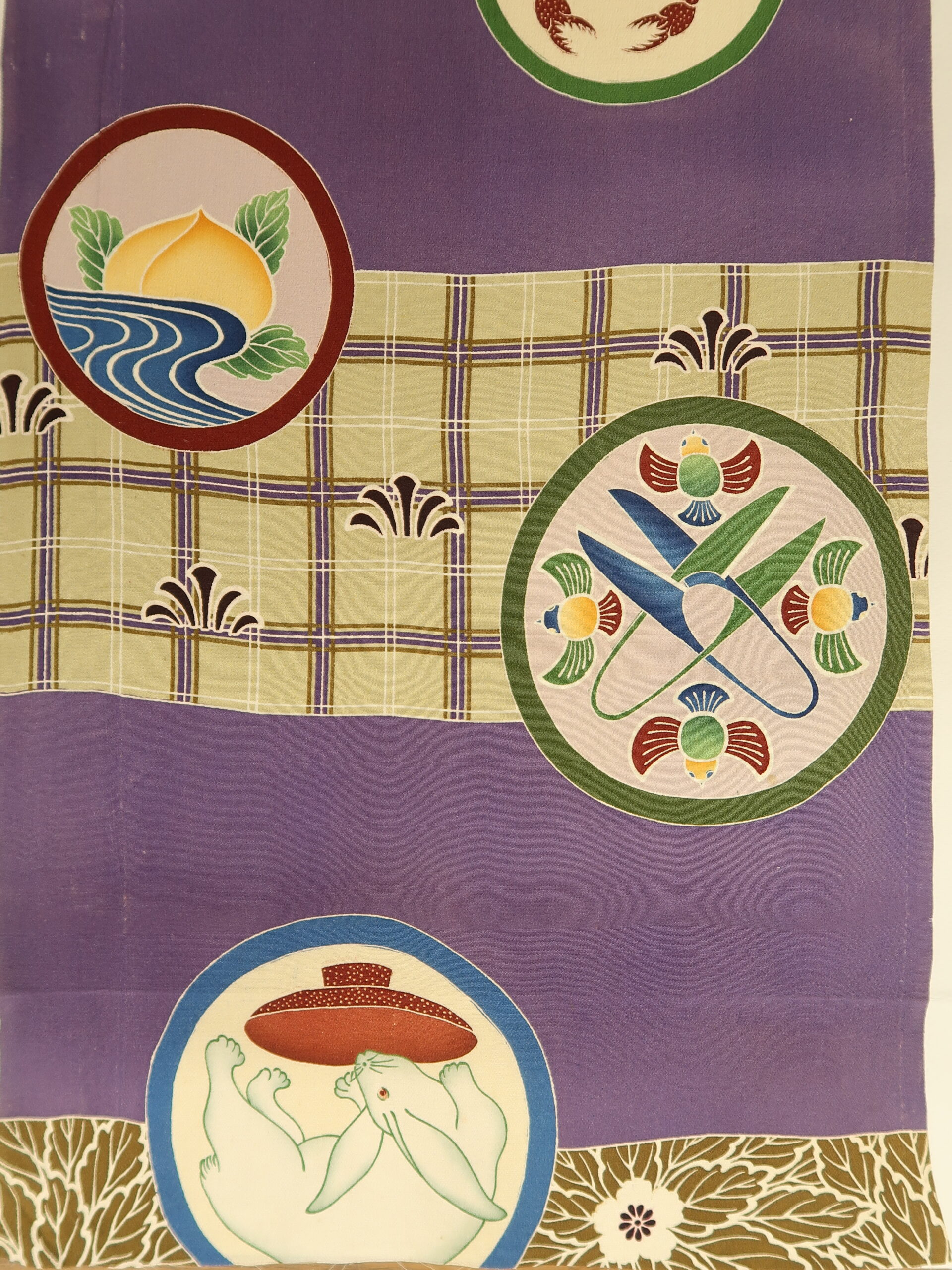 一幅に大きく描かれた七宝は、仏教の七種の宝に由来し、円が無限に繋がっていくことから円満、調和、子孫繁栄などの意味が込められています。