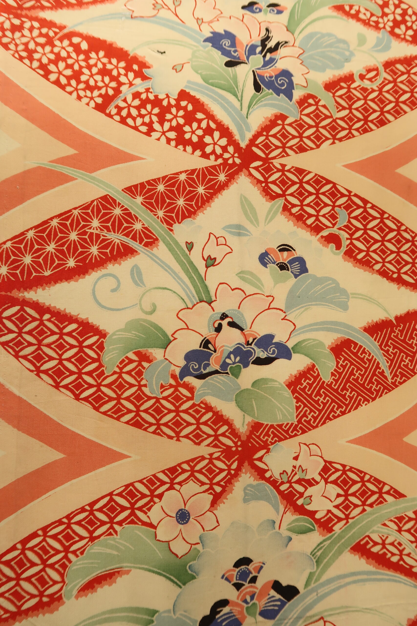 七宝の中に桜花、紗綾形、麻の葉の吉祥文様がふんだんに使われています。