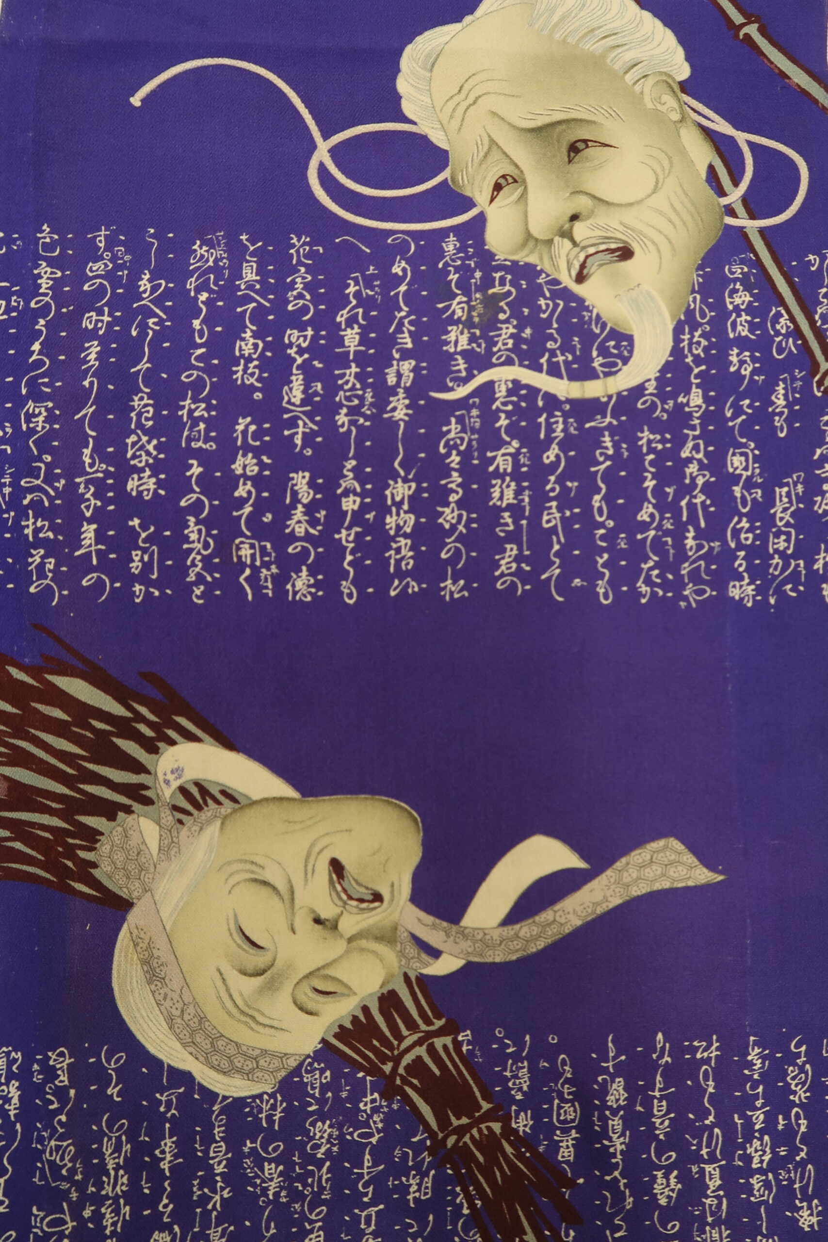 能の演目である高砂に出てくる老夫婦を表す能面とほうきの組み合わせ。