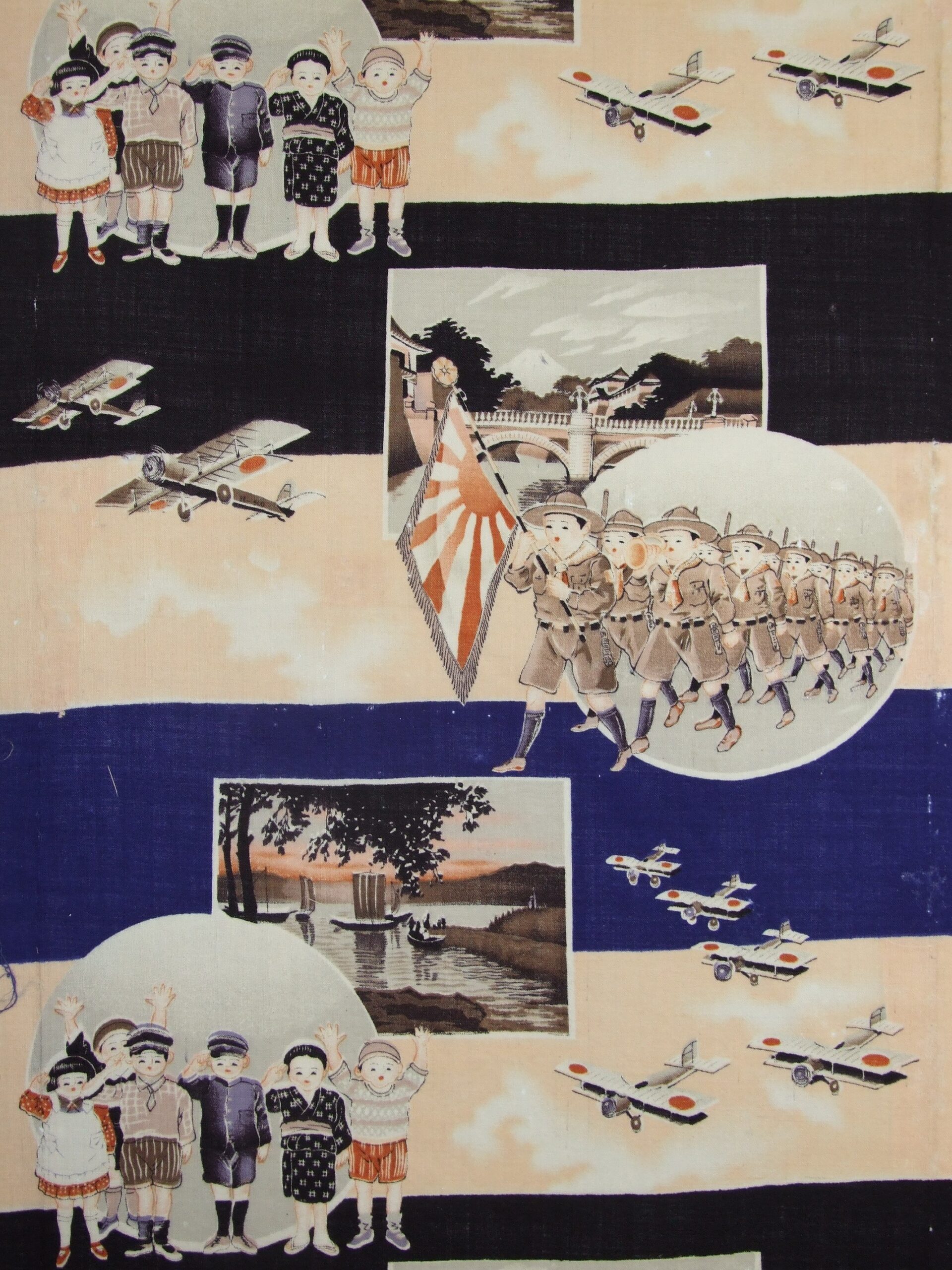 戦争柄は日清戦争頃より出まわったといわれ、大人・子供用は問わず、きものや帯、風呂敷などにも描かれ、富士山や戦闘機などは縁起が良い文様とされてました。その戦争柄は強いもの、勇ましいものを崇める(あがめる)といった時代の流れの中で生活の中に肯定的なイメージで入り込んでいったと言えます。